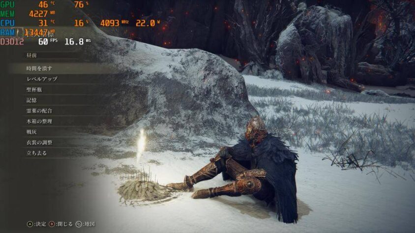 意外なポイントとして、エルデンリングは4K最高設定+レイトレONでもVRAM使用量が8GB以下に収まる。つまりVRAM 12GBや16GBが必要、ということはない。4K 60fps安定に必要なのはVRAM容量よりも「GPU演算力」のほうだ。ここを勘違いしてVRAM重視でパーツを選ぶと、俺の二の舞になるぞ。
