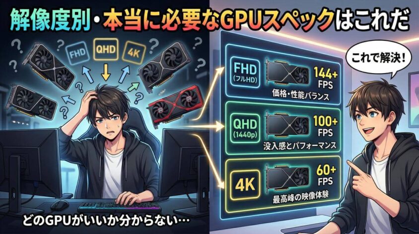 ここからは、「60fps安定で快適に遊べる」現実的なGPUスペックを、解像度別に解説する。