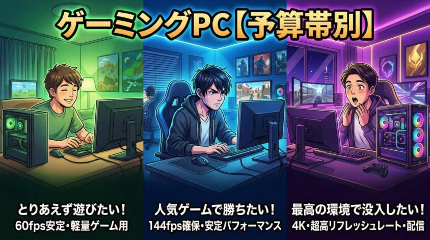 - 予算目安:ゲーミングPC本体で10万〜15万円程度